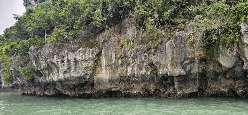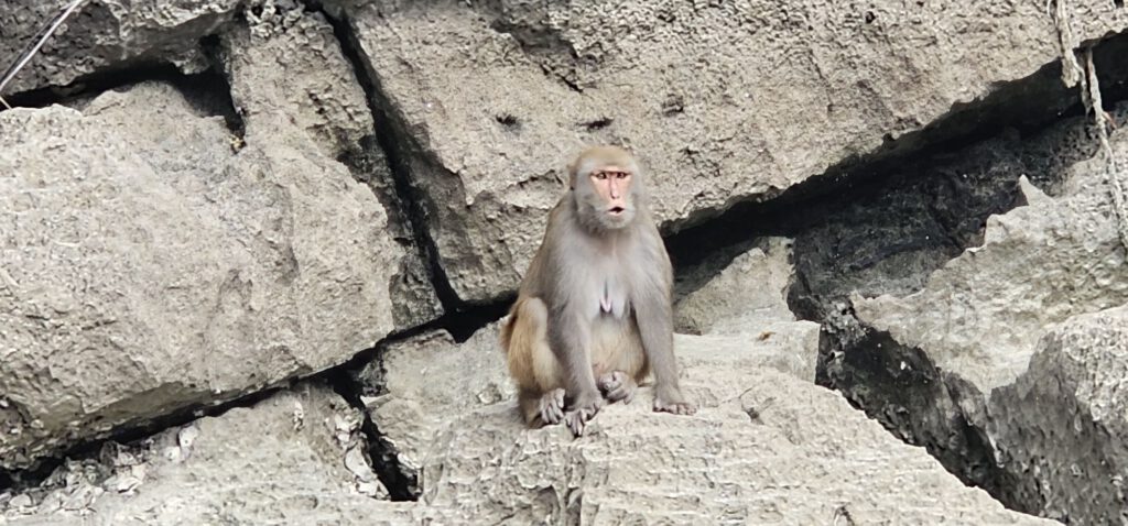 Auf den Felsen ringsum tummeln sich ganze Affenfamilien. Dies wohl auch, weil sie von den Bootsführern gefüttert werden. Das ist wieder ein Eingriff in die Natur, nur zur Belustigung der Touristen. Mir persönlich behagt das nicht.