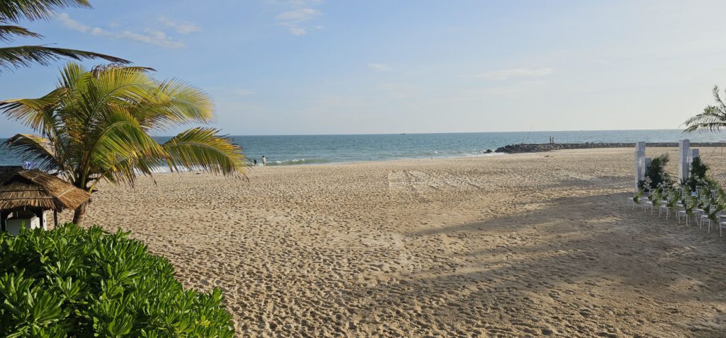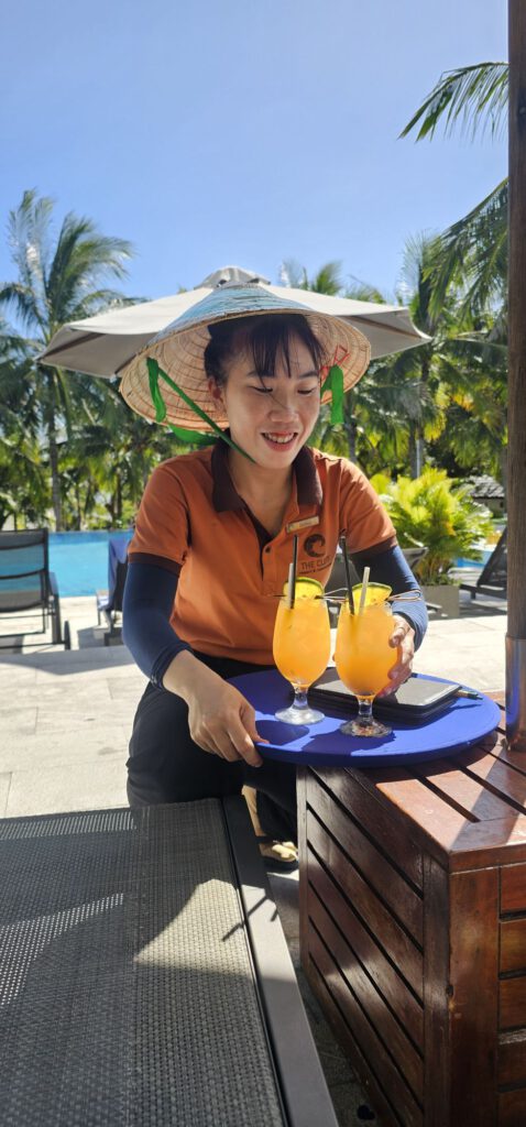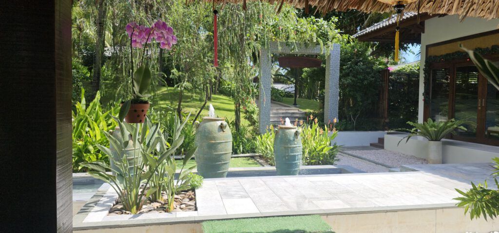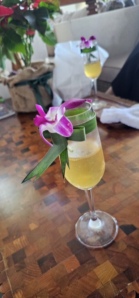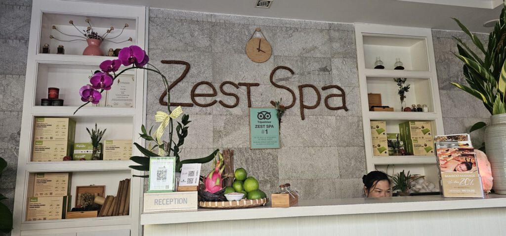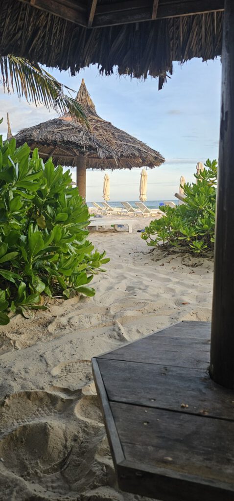 Hier können wir auf der Terrasse mit Meerblick frühstücken und Abendessen oder im Spa-Bereich wohltuende Massagen buchen.