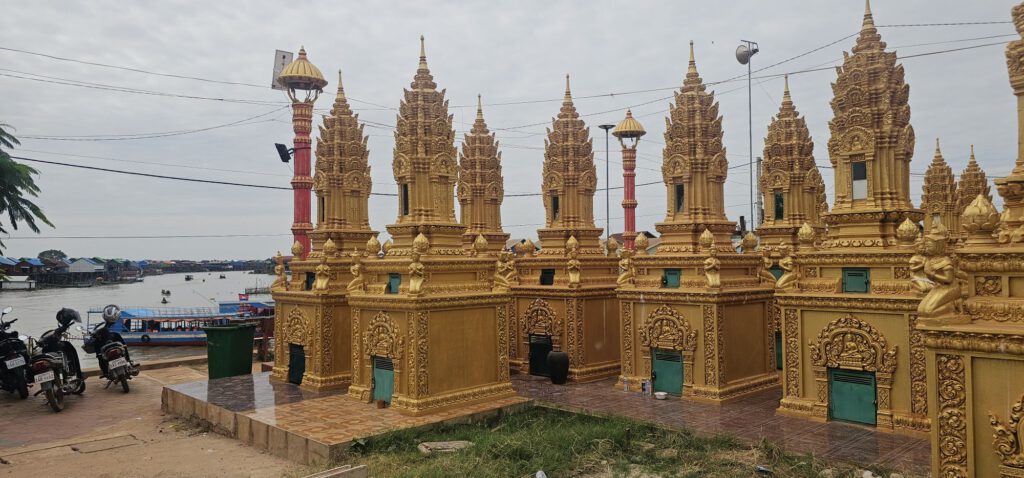 Der Reiseleiter erklärt uns, dass trotz der Armut auch hier der Buddhismus den Menschen durch die Hoffnung auf ein besseres Leben nach dem Tod macht. Daher bezahlen sie zB für diese goldfarbenen Pagoden den hier ungeheuren Preis von mehr als umgerechnet 3000 Euro. Obwohl sie nur von der Hand in den Mund leben, aber die Hoffnung wird teuer bezahlt. Das macht mich sehr betroffen. Ist doch überall auf der Welt das gleiche.